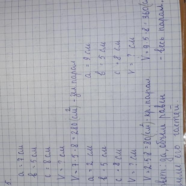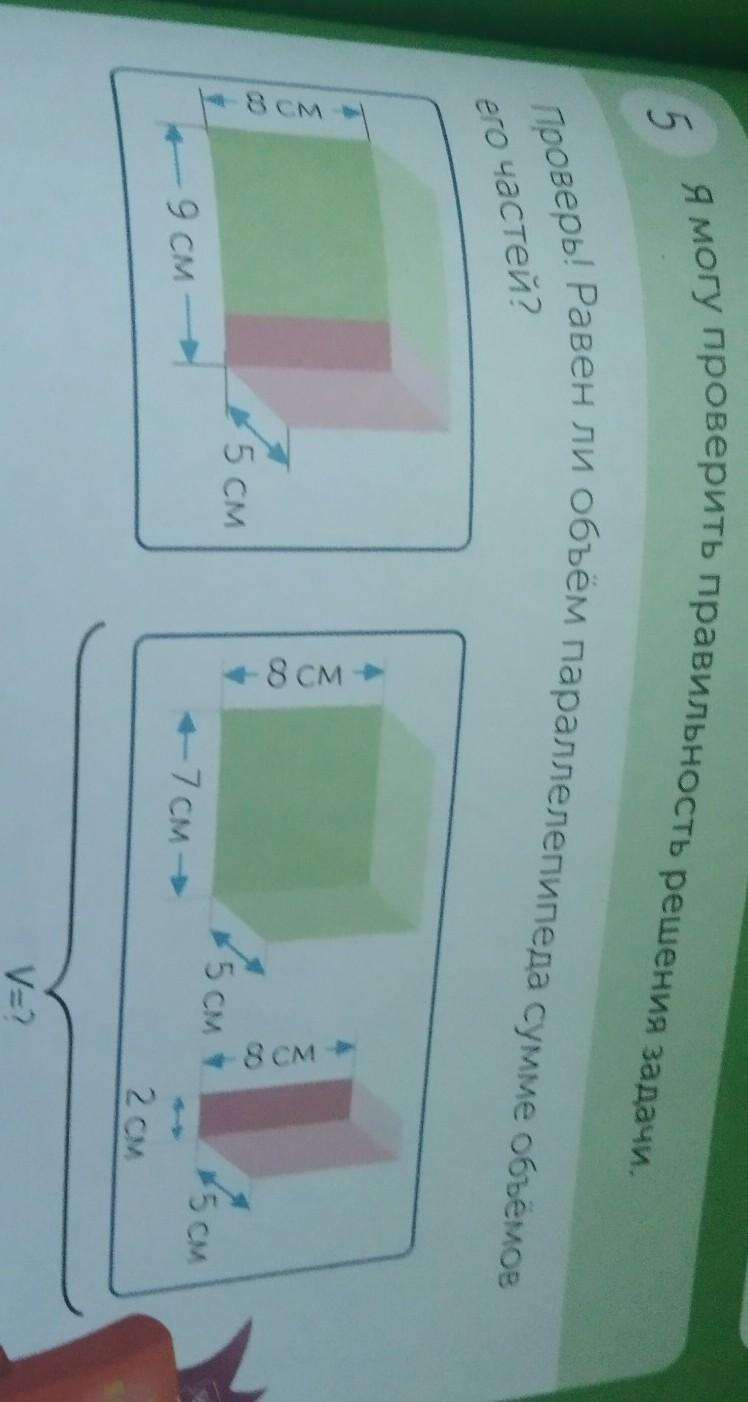 5 Я могу проверить правильность решения задачи. Проверь! Равен ли объем параллелепипеда сумме объемов его частей? 8см - -8 см -- -8 см 5 СМ 5 СМ 9 см - -7 см - 5 СМ 2 см у?