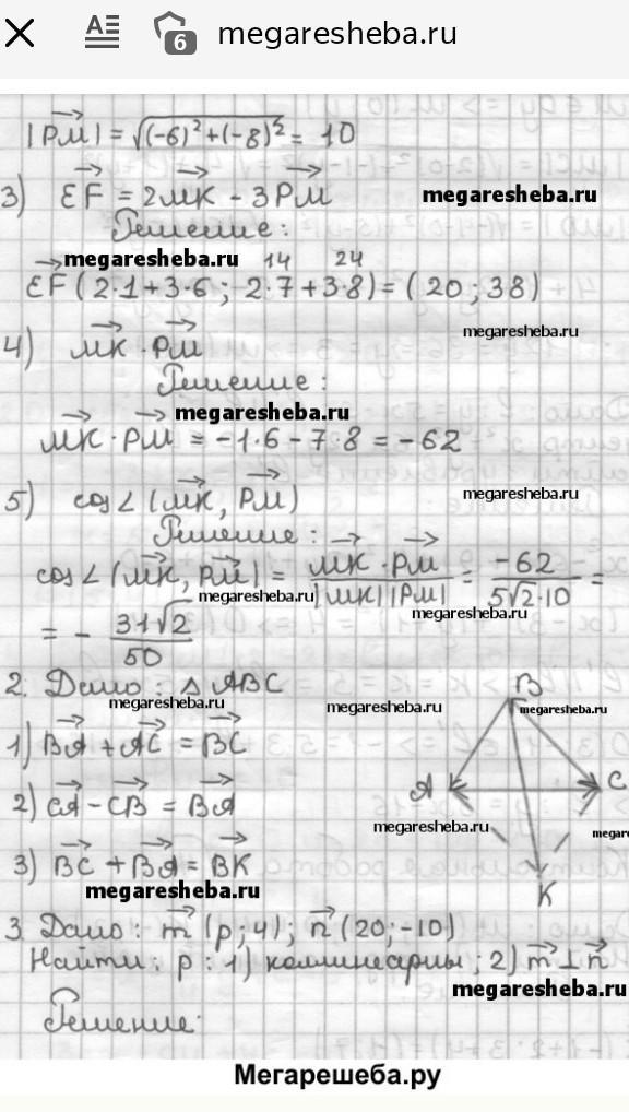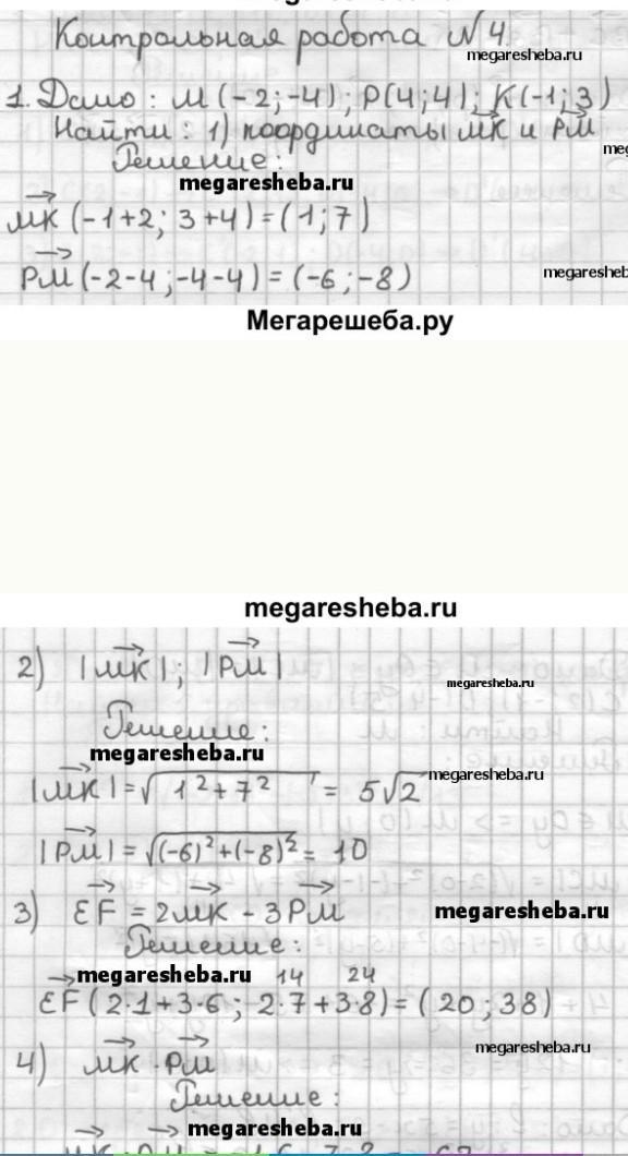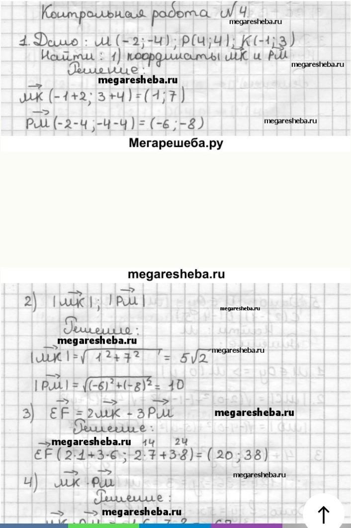 1. Даны точки М(-2;-4), Р(4;4), К(-1;3). Найдите: 1) Координаты векторов МК и РМ;