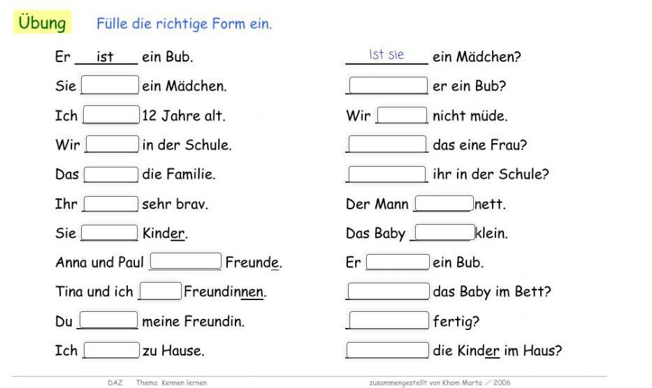 1 задание. Спряжение глагола sein. Вспомните, что глагол sein является вспомогательным и спрягается особым образом. Выполните упражнение, вставляя в пропуски верную форму глагола sein. Предложения пишите полностью, подчёркивая ту форму глагола, которую вы использовали.