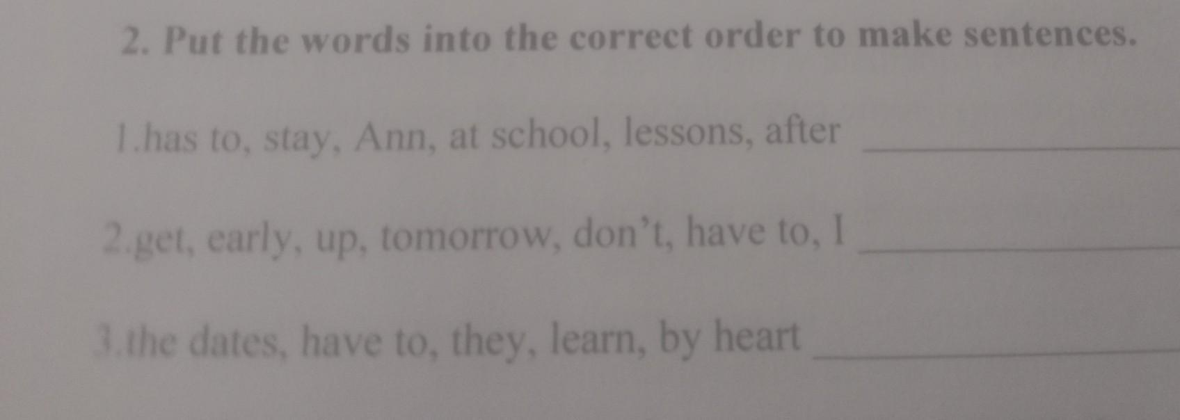 1. After lessons Ann has to stay at school. 2. I don't have to get up early tomorrow. 3. They have to learn the dates by heart.