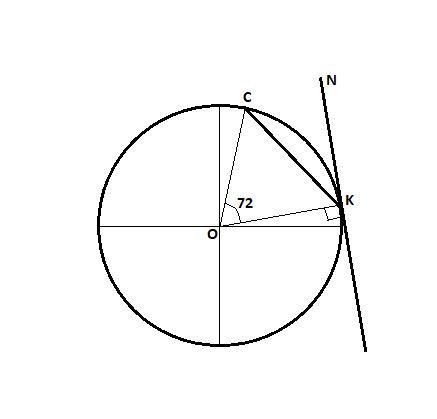 Найдите острый угол между хордой CK и касательной к окружности, проведённой через точку K, если хорда CK стягивает дугу окружности в 72 градуса.