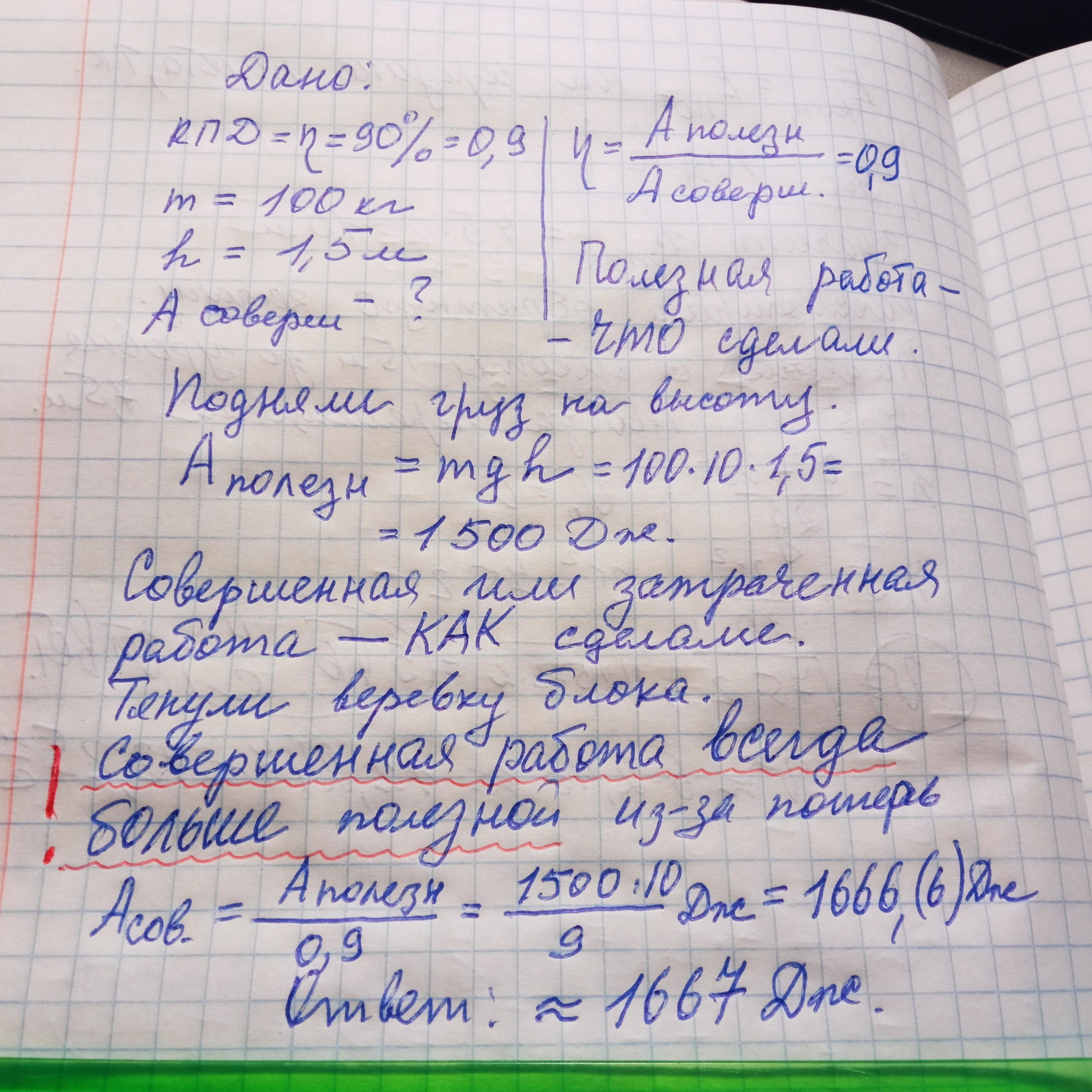 Решить задачу: С помощью подвижного блока, имеющего КПД 90 %, груз массой 100 кг подняли на высоту 1,5 м. Определите совершенную при этом работу.
