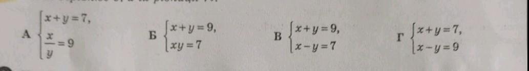 Серед наведених нижче систем укажіть ту, яка відповідає твердженню "Сума двох чисел дорівнює 9 , а їх рівняння 7"