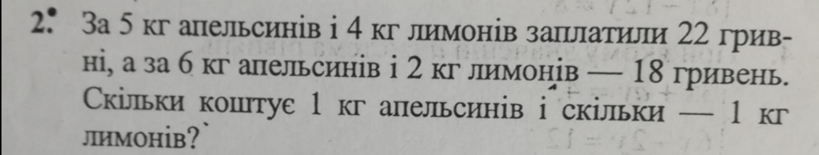 5кг апельсинов стоят 5x гривен , а 4 кг лиморов стоят 4y гривен .