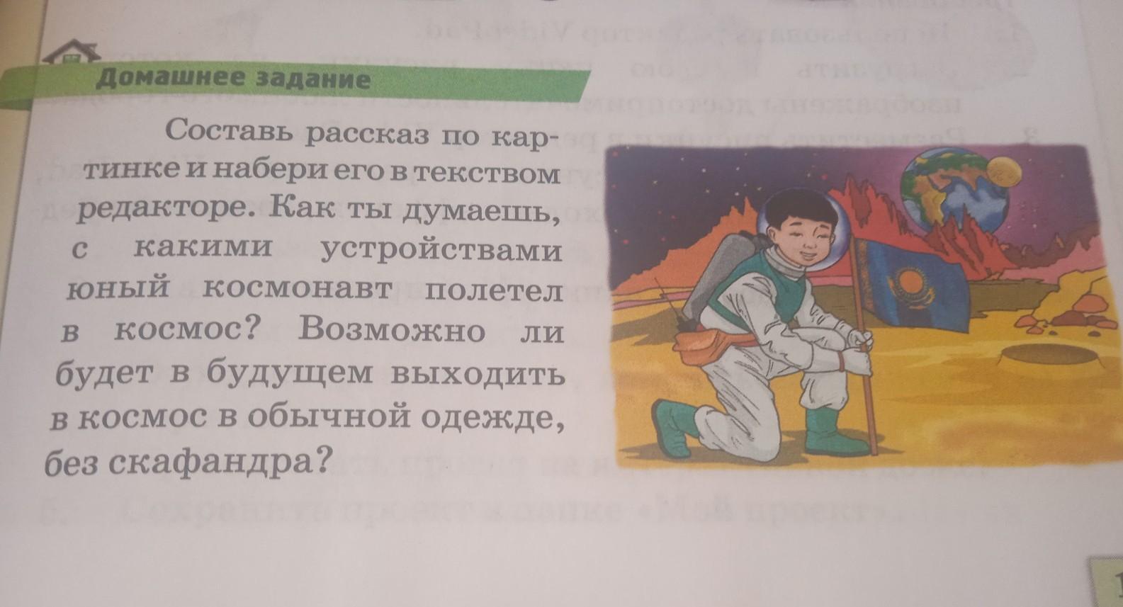 Составь рассказ по картинке и набери в текстовом редакторе.Как ты думаешь с какими устройствами юный космонавт полетел в космос?Возможно ли в будущем выходить в космос в обычной одежде,без скафандра?