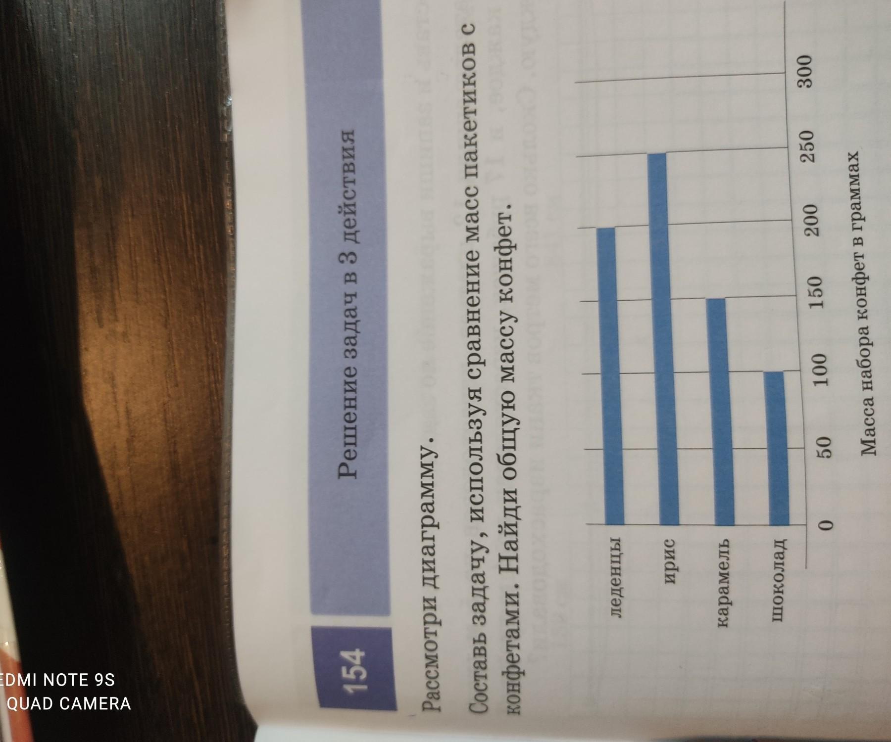 154 Решение задач в 3 действия Рассмотри диаграмму. Составь задачу, используя сравнение масс пакетиков с конфетами. Найди общую массу конфет.