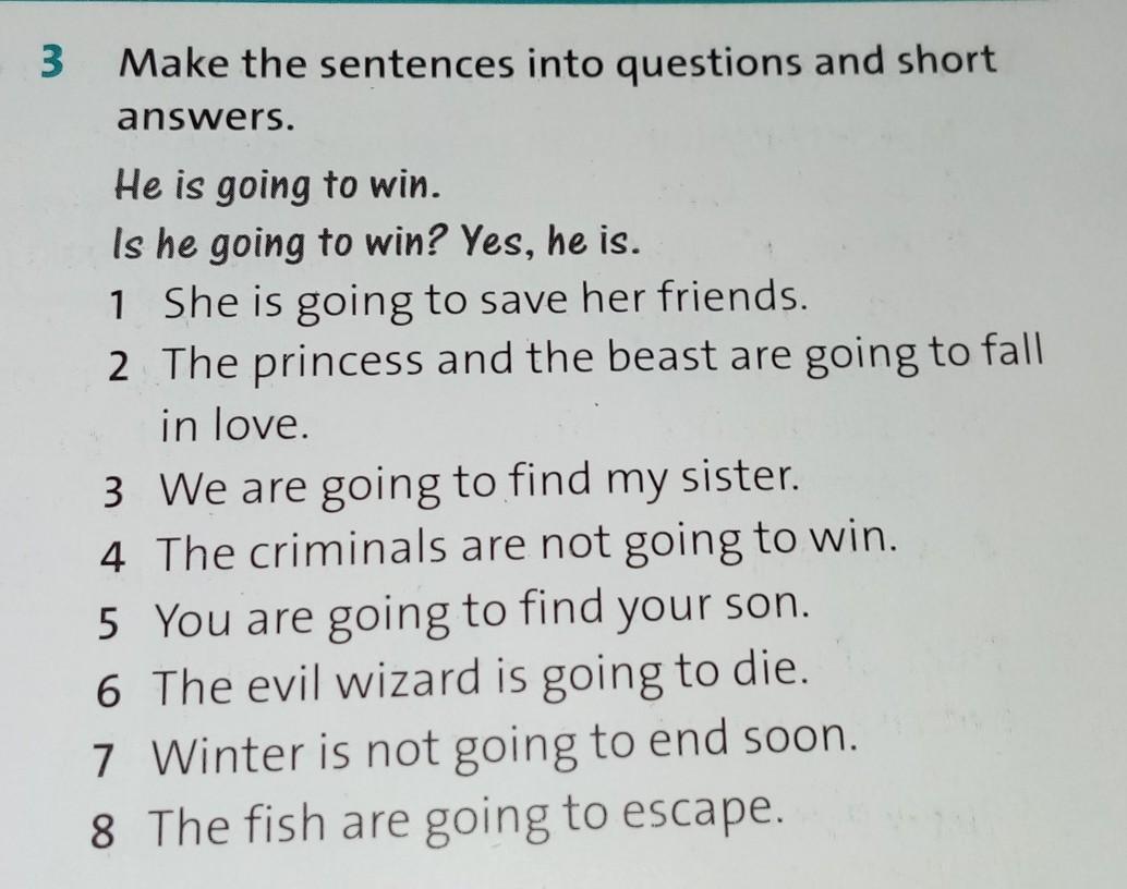 (1) Is she going to save her friends? Yes, she is Com 2) Are the princess and the beast going to fall in love? Yes, they are 3) Are we going to find my sister? Yes, we are 4) Are the criminals going to win? No, they are not 5) Are you going to find your son? Yes, I am KZ06) is the evil wizard going to die? Yes, he is con