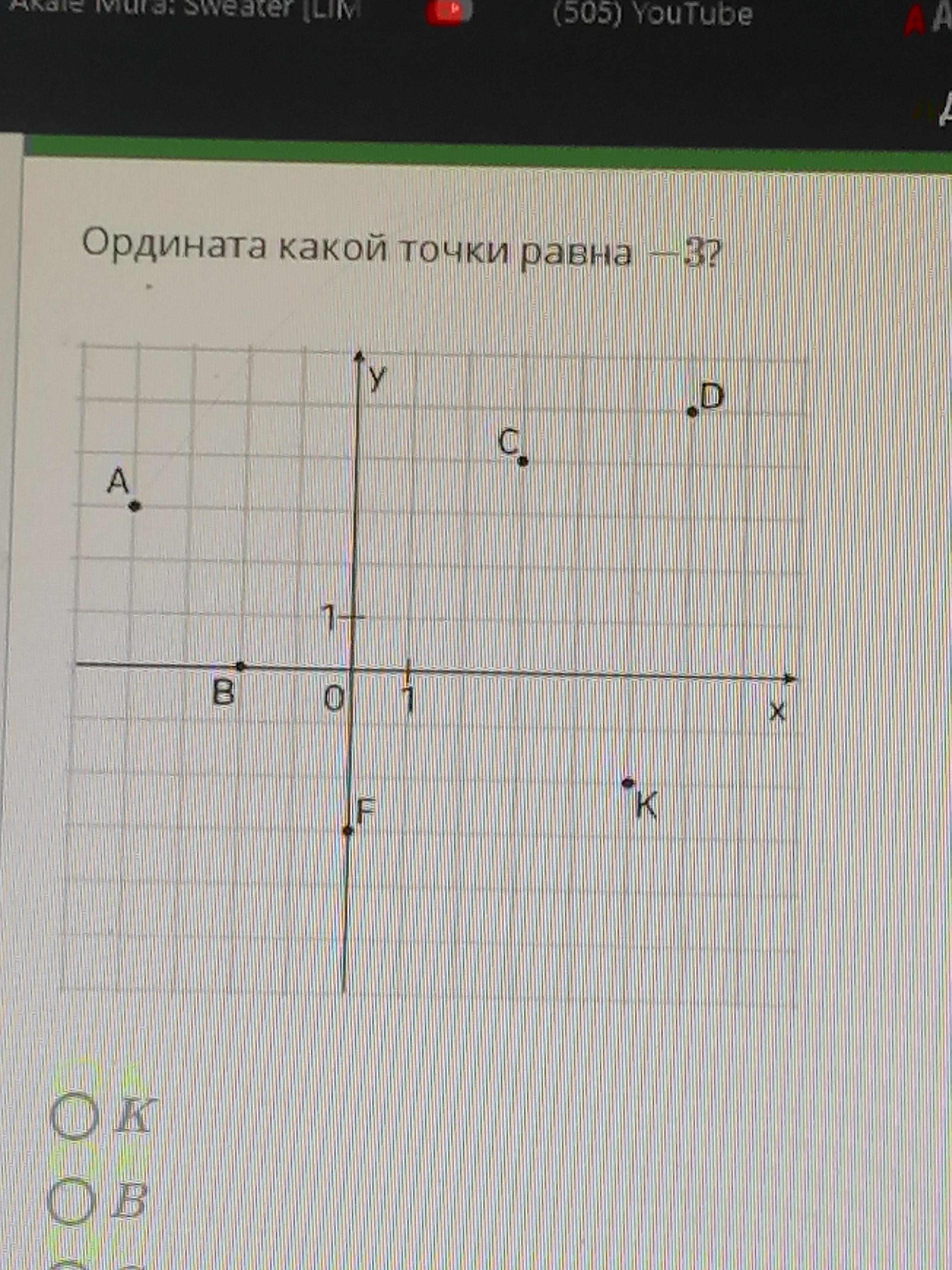 Ордината - это значение точки на координате y. Это значит, что мы должны смотреть на ось y. Ордината равна - 3 -- это значит, что мы должны смотреть на нижнюю часть оси y ( та, что ниже 0 ). Единственная точка, отвечающая всем требованиям - точка F.