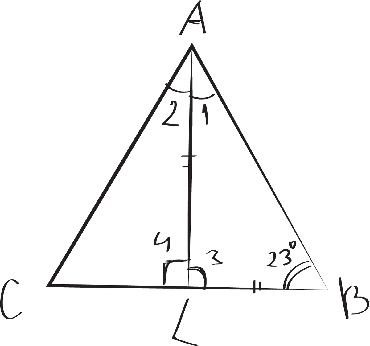 Так как AL=LB,значит ΔALB - равнобедренный,из этого следует,что <B=<1=23градуса,значит <3=180-(23+23)=134