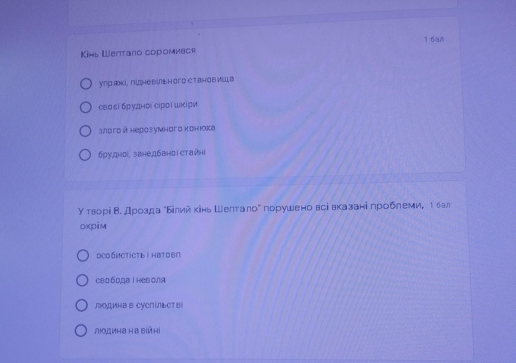 2. У творі В. Дрозда «Білий кінь Шептало» порушено всі вказані проблеми , окрім людина на війна