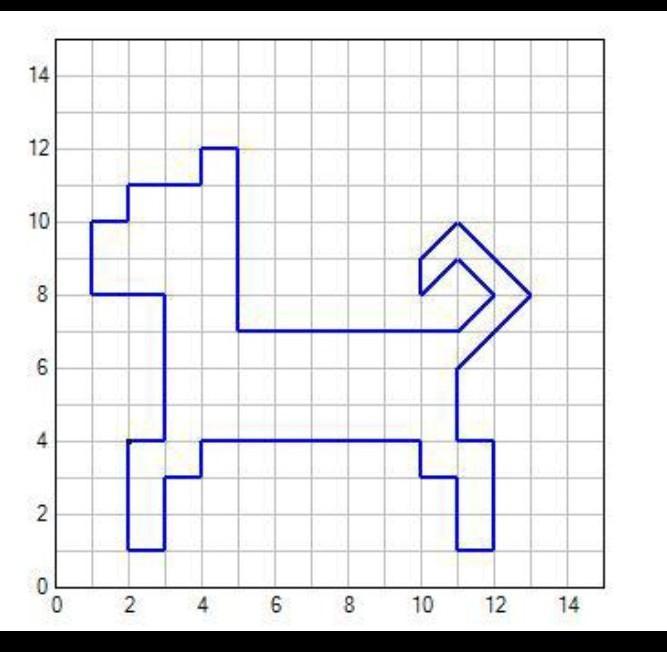 На кординатной плоскости отметьте и пронумеруйте точки:(2, 4),(3,4),(3,8),(1,8),(1,10),(2,10),(2,11),(4,11),(4,12),(5,12),(5,7),(11,7),(12,8),(11,9),(10,8),(10,9),(11,10),(13,8),(11,6),(11,4),(12,4),(12,1),(11,1),(11,3),(10,4),(4,4),(4,3),(3,3),(3,1),(2,1),(2,4)