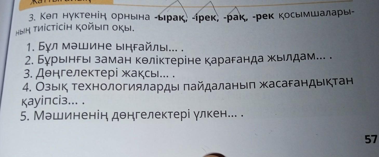 3. Көп нүктенің орнына -ырақ, -ірек, -рақ, -рек қосымшалары- ның тиістісін қойып оқы. 1. Бұл мәшине ыңғайлы.... 2. Бұрынғы заман көліктеріне қарағанда жылдам... . 3. Дөңгелектері жақсы.... 4. Озық технологияларды пайдаланып жасағандықтан 5. Мәшиненің дөңгелектері үлкен.... қауіпсіз... .