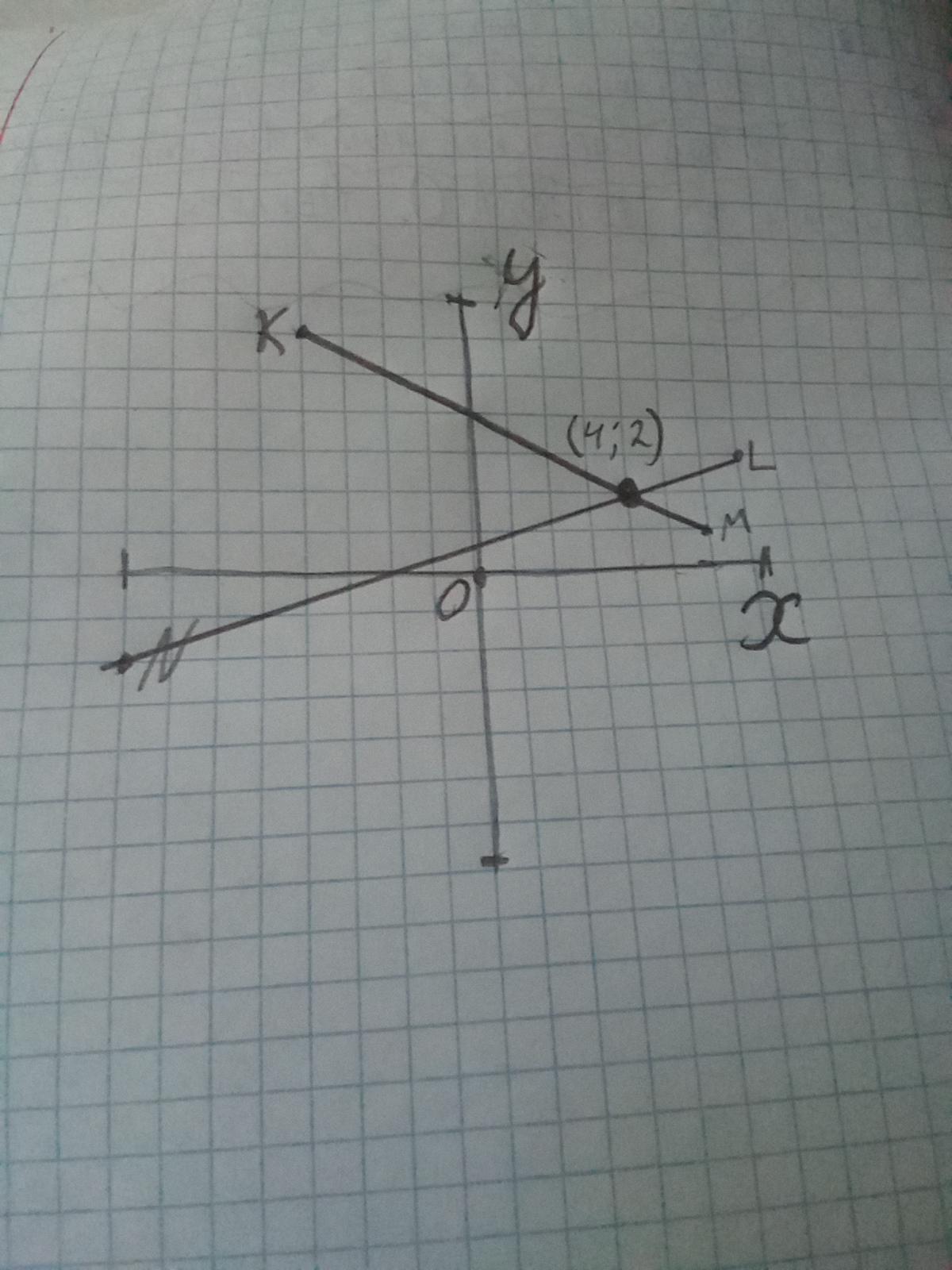 Отметьте на координатой плоскости точки K(-4;6),M(6;1),N(-8;-2),L(7;3). Проведите прямые KM и NL. Найдите координаты точки пересечения этих прямых