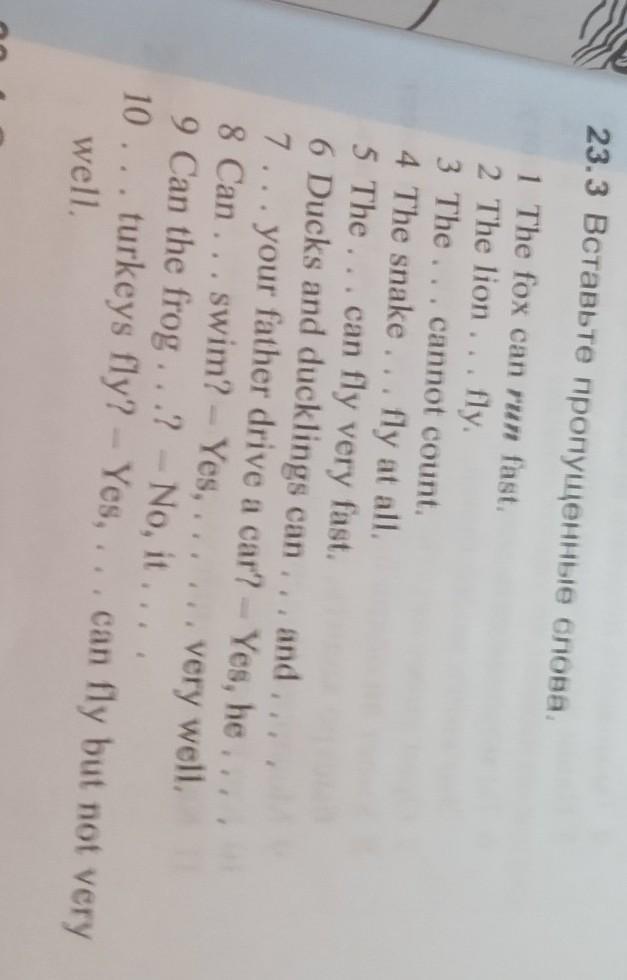 23.3 Вставьте пропущенные слова. 1 The fox can run fast. 2 The lion ... fly 3 The... cannot count. 4 The snake... fly at all. 5 The ... can fly very fast. 6 Ducks and ducklings can ... and.... 7... your father drive a car? Yes, he ... 8 Can ... swim? - Yes, ... 9 Can the frog ...? - No, it... 10 ... turkeys fly? - Yes, ... can fly but not very well very well.