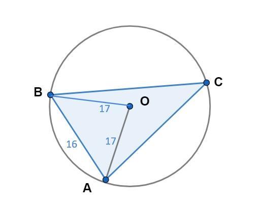 пусть центр О- центр окружности с радиусом , равным 17, описанной около треугольника АВС , лежит внутри треугольника. Найдите площадь треугольника АОВ , если АВ = 16