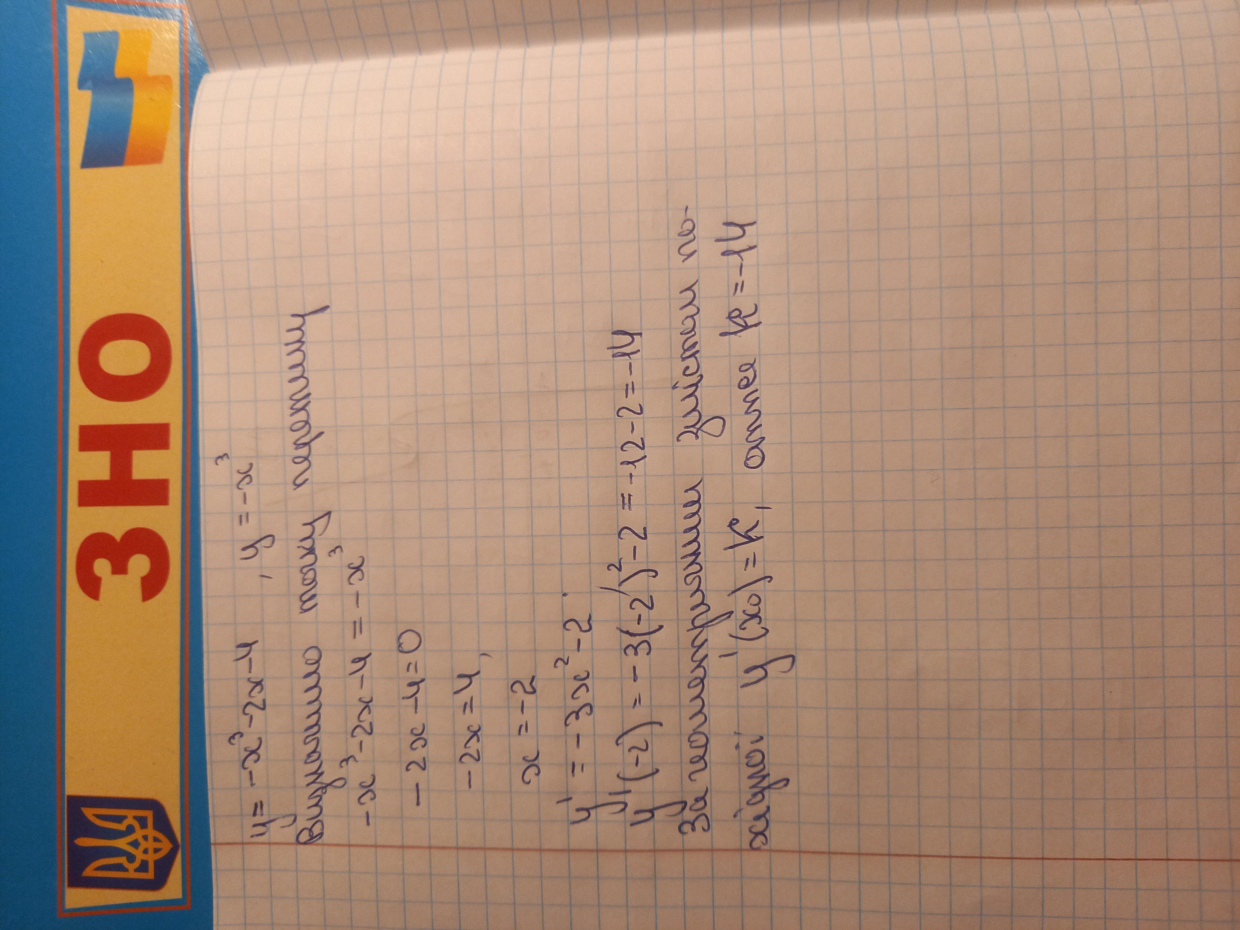 Знайти кутовий коефіцієнт дотичної, яку проведено до графіка функцій y=-x^3-2x-4 у точці перетину її із функцією y=-x^3