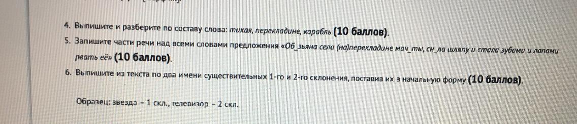 5. Обезьяна-сущ., села-глагол, на-предлог, перекладине-существительное, мачты-сущ., сняла-глагол, шляпу-сущ., и-союз, стала-глагол, зубами-сущ., и-союз, лапами-сущ., рвать-глагол, её-местоимение.