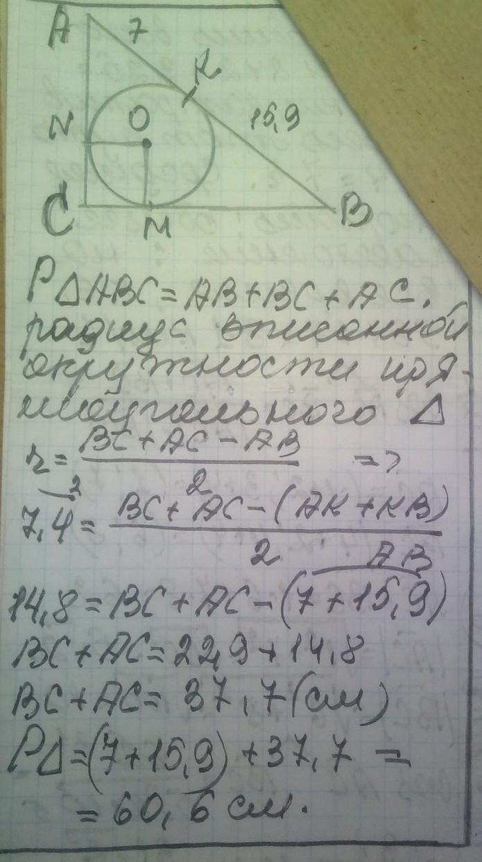 Окружность с радиусом 7.4см вписана в прям. треугольник. Найдите периметр треугольника, если точка касания q телит гипотенузу на отрезки равные 15,9,7 см