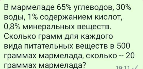 В мармеладе 65% углеводов, 30% воды, 1% содержанием кислот, 0,8% минеральных веществ. Сколько грамм для каждого вида питательных веществ в 500 граммах мармелада, сколько -- 20 граммах мармелада?