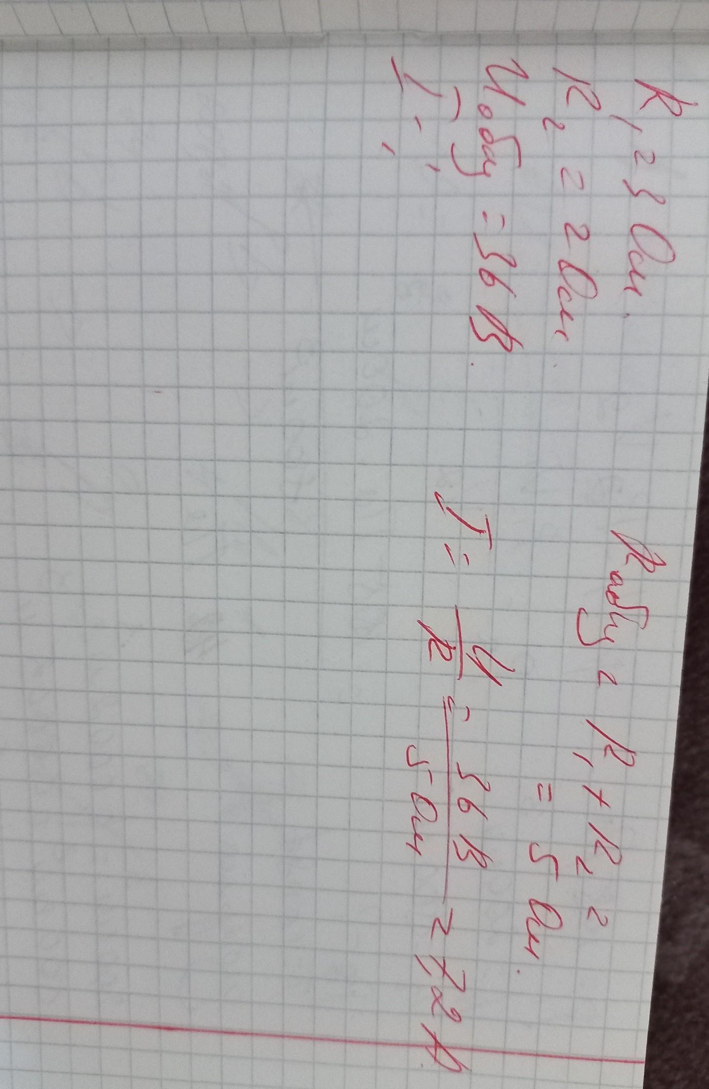В электрическую цепь последовательно включены лампочка сопротивлением 3 Ом и 2 Ом. Общее напряжение в цепи 36 В. Определите силу тока в цепи.