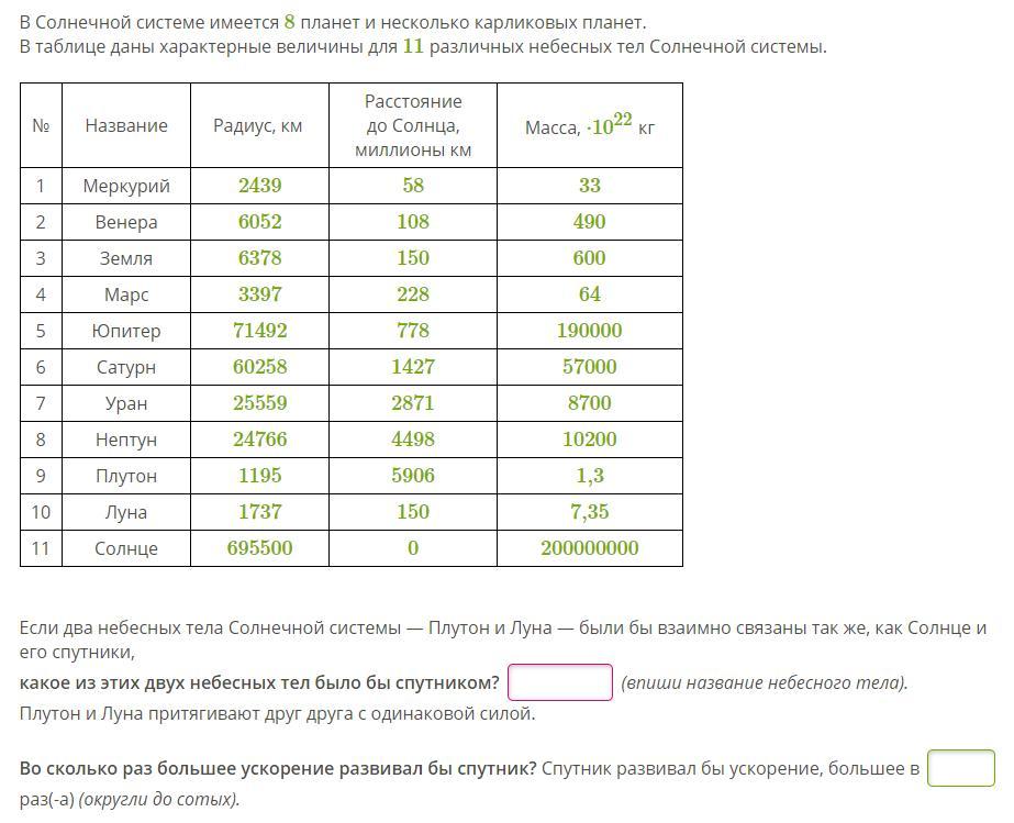 В Солнечной системе имеется 8 планет и несколько карликовых планет. В таблице даны характерные величины для 11 различных небесных тел Солнечной системы.