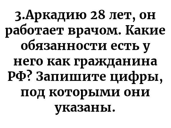 1) участвовать в управлении делами государства 2) вносить вклады в кредитные учреждения 3) заботиться о сохранении исторического и культурного наследия 4) платить налоги 5) заботиться о нетрудоспособных родителях 6) выбирать место пребывания и жительства