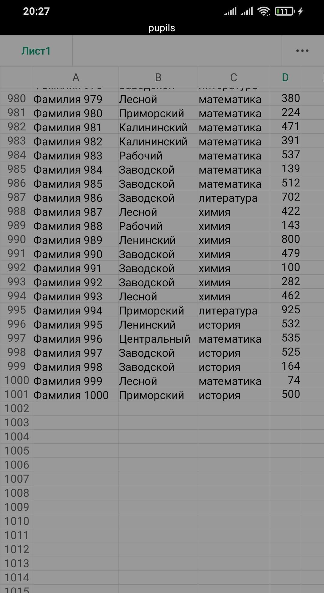 Выполните задание. Откройте файл с данной электронной таблицей pupils.xls). На основании данных, со- держащихся в этой таблице, выполните задания: 1. Сколько учащихся Ленинского района среди тех, кто проверял свои знания по истории или по музыке, набрали от 300 до 500 баллов включительно? Ответ запишите в ячейку H2 таблицы. 2. Найдите наименьший тестовый балл учащихся Южного и Приморского района, которые проверяли свои знания по истории или по литературе. Ответ запишите в ячейку НЗ таблицы. 3. Постройте круговую диаграмму, отображающую соотношение количеств участников из Центрального района, набравших не более 500 баллов, проходивших тестирование по химии, музыке, истории, литературе. Левый верхний угол диаграммы разместите вблизи ячейки G6.