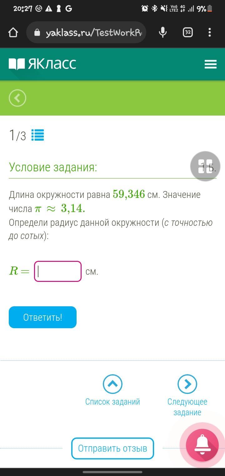 R = 59,346 : (2 * 3,14) = 59,346 : 6,28 = 9,45 см