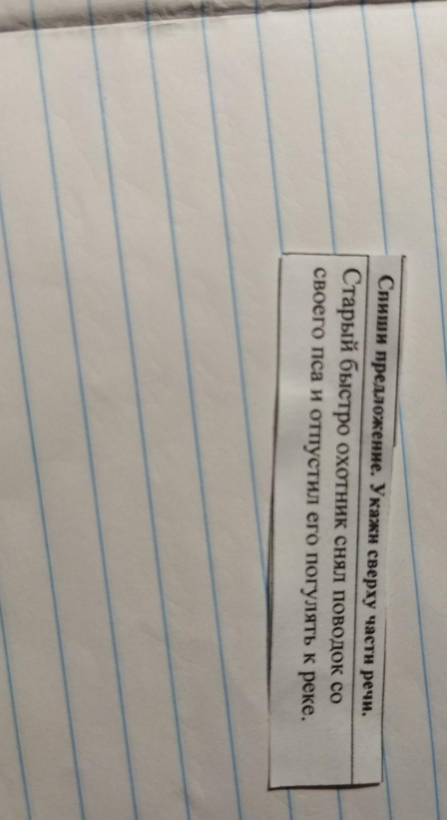 Ответ:Старый ( прилагательное) быстро (наречие) охотник ( существительное) снял (глагол) поводок (существительное) со ( предлог) своего ( местоимение) пса ( существительное) и (союз) отпустил (глагол) его ( местоимение) погулять (глагол) к ( предлог) реке ( существительное)