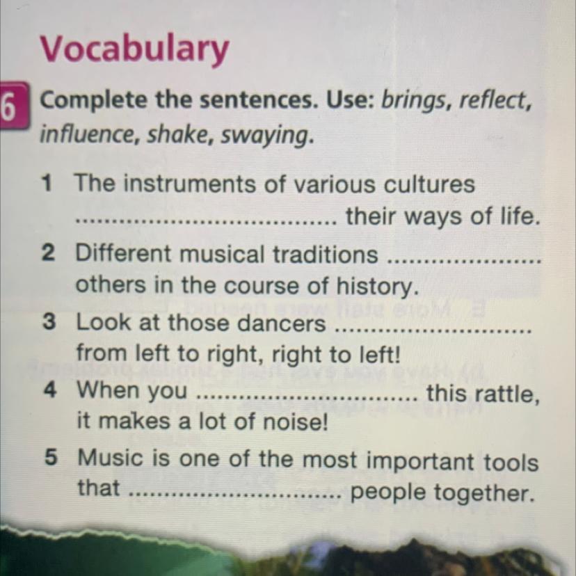 1.reflect 2.influence 3.swaying 4.shake 5.brings