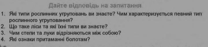 1. Ліси( хвойні, широколисті, мішані ), луки, степи та болота. Характеризується ярусністю, видовим складом організмів.