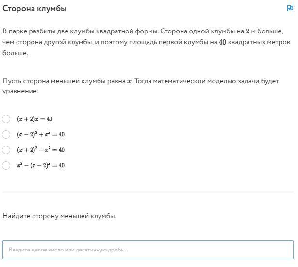 Пусть сторона меньшей клумбы равна х. Тогда математической моделью задачи будет уравнение: