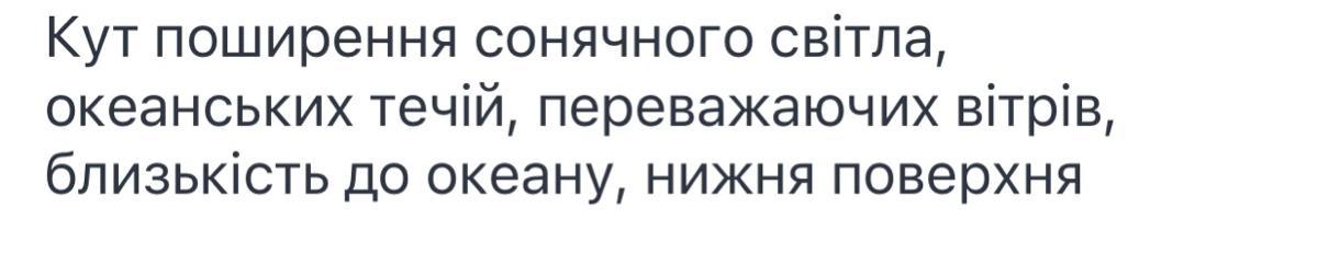 Кут поширення сонячного світла, океанських течій, переважаючих вітрів, близькість до океану, нижня поверхня