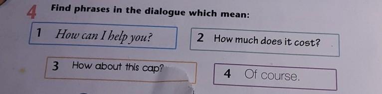 тебе нужно найти эти фразы в диалоге.эти фразы переводятся:1как я могу вам помочь; 2. сколько это стоит; 3. как насчёт этой кепки?; 4. конечно.