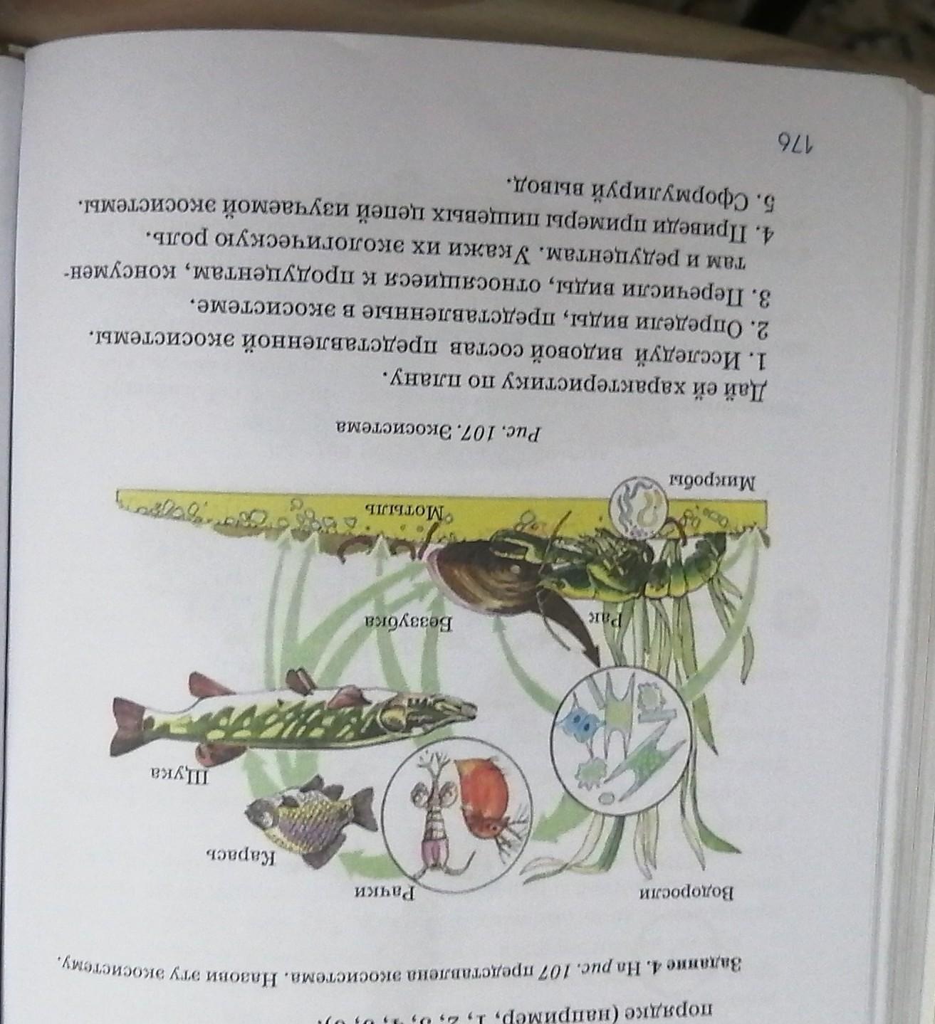 Задание 4. На рис. 107 представлена экосистема. Назови эту экосистему. Водоросли Рачки Карась Щука Рак Беззубка боо Мотыль Микробы Буре Рис. 107. Экосистема Дай ей характеристику по плану. 1. Исследуй видовой состав представленной экосистемы. 2. Определи виды, представленные в экосистеме. 3. Перечисли виды, относящиеся к продуцентам, консумен- там и редуцентам. Укажи их экологическую роль. 4. Приведи примеры пищевых цепей изучаемой экосистемы. 5. Сформулируй вывод.