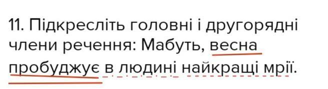 11. Підкресліть головні і другорядні члени речення: Мабуть, весна пробуджує в людині найкращі мрії.