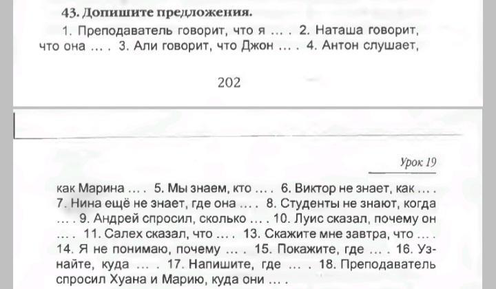Преподаватель говорит, что я хорошо отвечаю на уроках. Наташа говорит, что она сегодня очень устала. Али говорит, что Джон любит читать. Антон слушает, как Марина рассказывает о себе. Виктор не знает, как решить этот пример. Нина ещё не знает, где она находится. Студенты не знают, когда у них следующая пара. Антон спросил, сколько сейчас времени. Луис сказал, почему он опоздал. Салех сказал, что ему скучно. Скажите мне завтра, что надеть. Я не понимаю, почему я заболел. Покажите, где находится это здание. Узнайте, куда мне нужно будет подойти. Напишите, где вы. Преподаватель спросил Хуана и Марию, куда они пропали.