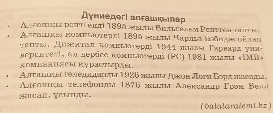 Өнертабыс: Компьютер; ашылған жылы: 1895 жылы негізін қалаушы Чарльз бэбидж. Өнертабыс: теледидар ; ашылған жылы 1926 жылы ; Негізін қалаушы: Джон Логи Бэрд. Өнертабыс: телефон ;ашылған жылы:1876 жылы ; негізін қалаушы :Александр Грэм Белл