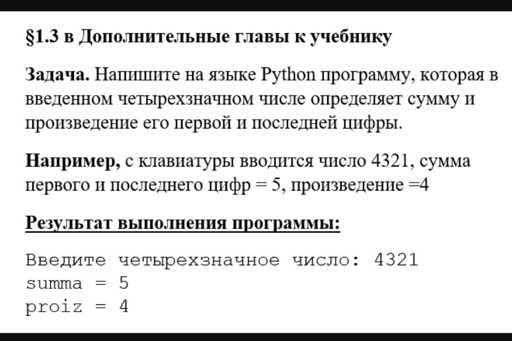$1.3 в Дополнительные главы к учебнику Задача. Напишите на языке Python программу, которая в введенном четырехзначном числе определяет сумму и произведение его первой и последней цифры.