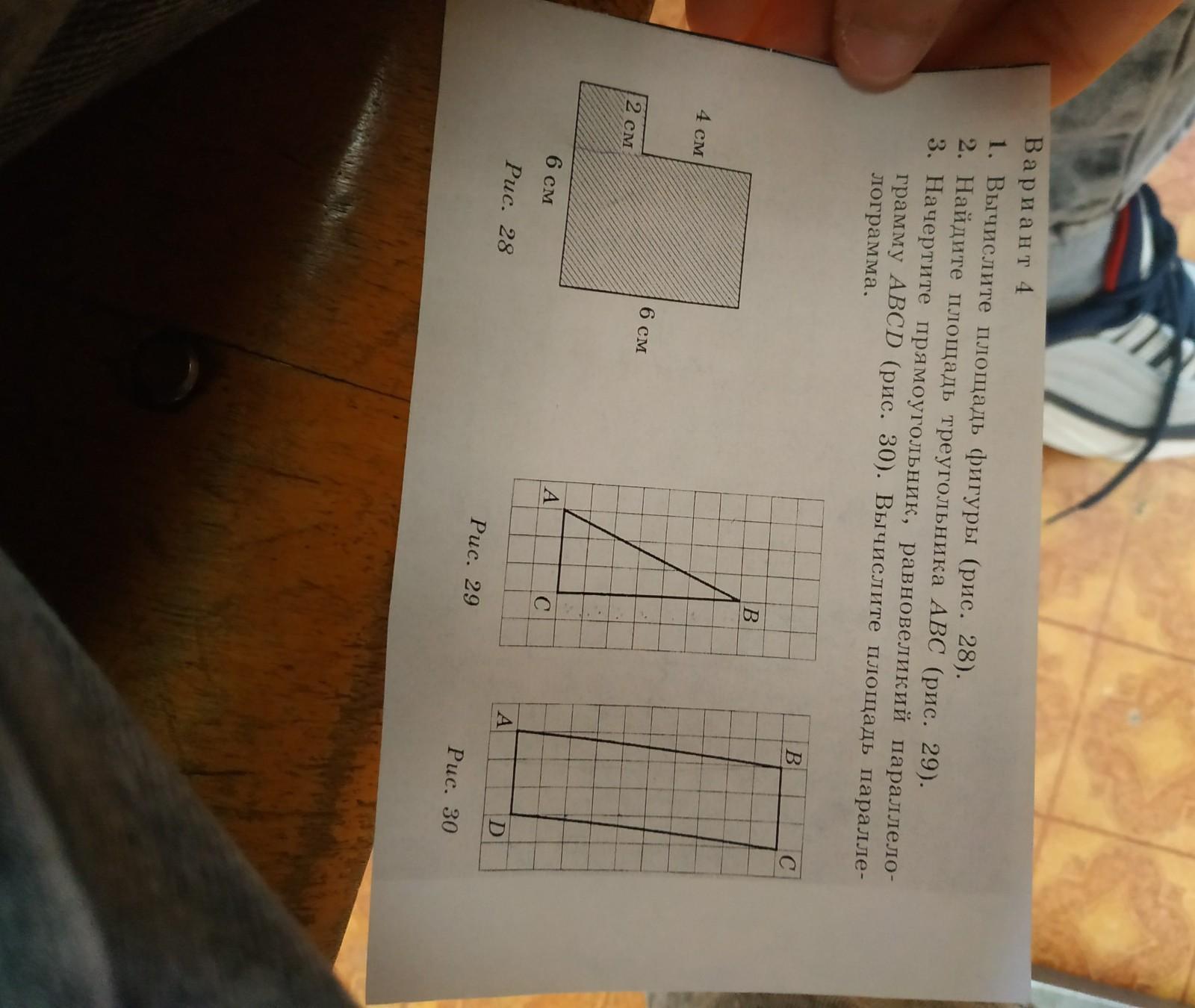 Х Вариант 4 1. Вычислите площадь фигуры (рис. 28). 2. Найдите площадь треугольника ABC (рис. 29). 3. Начертите прямоугольник, равновеликий параллело- грамму ABCD (рис. 30). Вычислите площадь паралле- лограмма. В С B 4 см 6 см 2 см 6 см A с Рис. 28 А D Рис. 29 Рис. 30