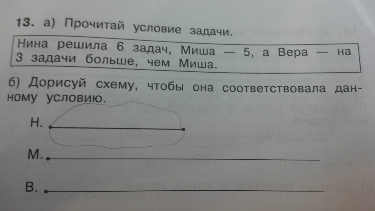 нина решила 6 задач,Миша-5,а Вера -на 3 задачи больше,чем Миша.Дорисуй схему,чтобы она соответствовала данному условию