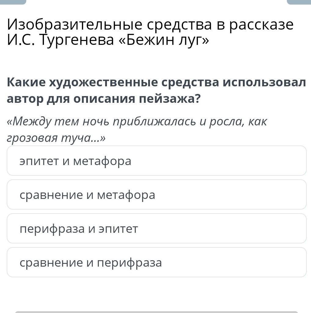 Изобразительные средства в рассказе И.С. Тургенева «Бежин луг» Какие художественные средства использовал автор для описания пейзажа? «Между тем ночь приближалась и росла, как грозовая туча...» эпитет и метафора сравнение и метафора перифраза и эпитет сравнение и перифраза