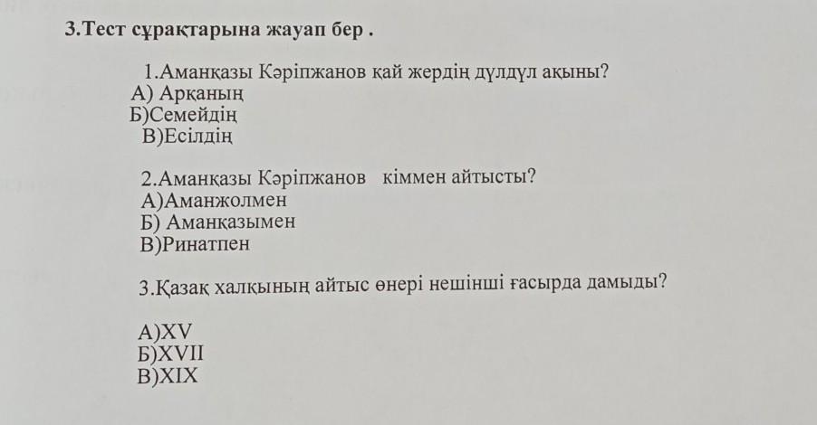 3.Тест сұрақтарына жауап бер. 1.Аманқазы Кәріпжанов қай жердің дүлдүл ақыны? А) Арқаның Б)Семейдің В)Есілдің