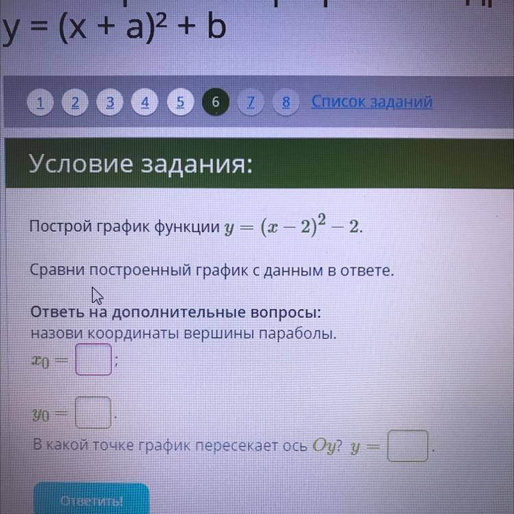 Построй график функции y = (х — 2)2 – 2.