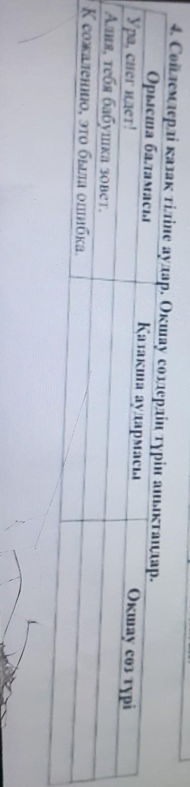4. Сөйлемдерді қазақ тіліне аудар. Оқшау сөздердің түрін анықтаңдар. Орысша баламасы Казакша аудармасы Оқшау сөз түрі ра, снег идет! ия, тебя бабушка зовет. сожалению, это была ошибка.