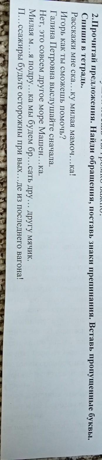 2.Прочитай предложения.Найди обращения, поставь знаки препинания Вставь пропущенные буквы