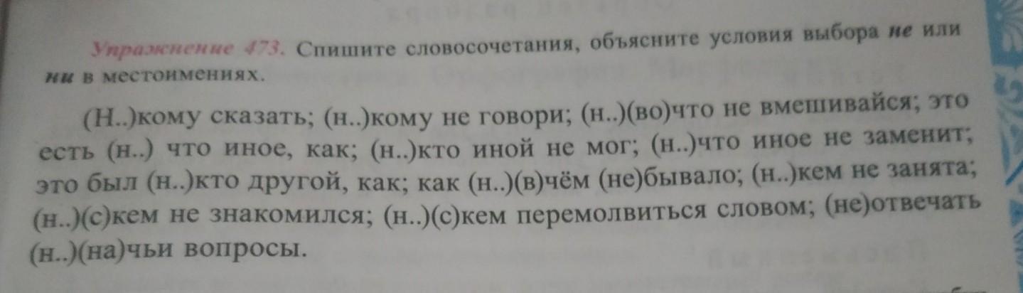 Упражнение 473. Спишите словосочетания, объясните условия выбора не или ни в местоимениях. (Н.)кому сказать; (н..)кому не говори; (н..) (во)что не вмешивайся, это есть (н..) что иное, как; (н..)кто иной не мог; (н..) что иное не заменит; это был (н..)кто другой, как; как (н.) (в) чём (не)бывало; (н..) кем не занята; (н..)(c)кем не знакомился; (н.)(c)кем перемолвиться словом; (не)отвечать (н.) (на)чьи вопросы.
