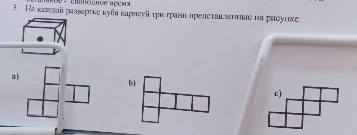 3. На каждой развертке куба нарисуй три грани представленные на рисунке: a) b) C) А