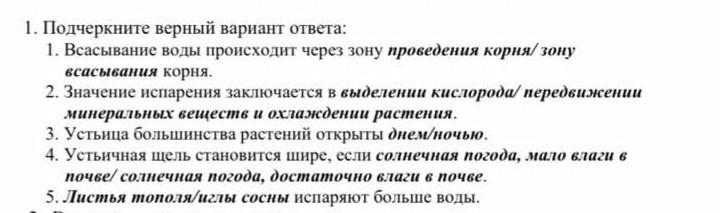 1.зона всасывания. 2.передвижение минеральных веществ и охлаждение растения. 3.ночью. 4. достаточно влаги в почве. 5.листья тополя.