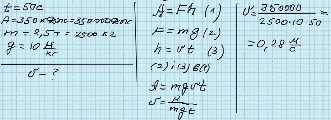Будівельний кран протягом 50 с рівномірно підіймав вантаж, ви- конавши роботу 350 кДж. Чому дорівнює швидкість руху вантажу, якщо його маса становить 2,5 т? g = 10 = Н/кг. Помогите срочно
